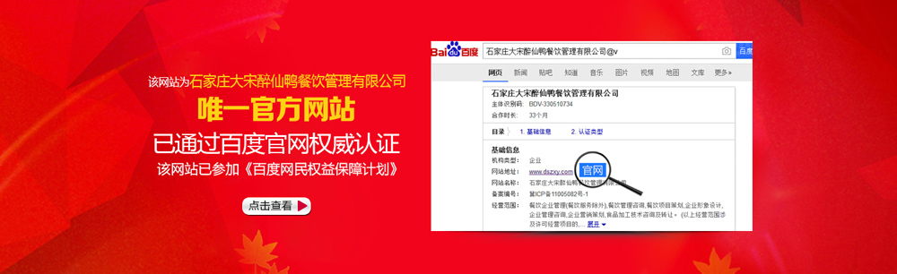 隨著產(chǎn)品的升級(jí),大宋醉仙鴨總部的經(jīng)營(yíng)理念不斷提升,經(jīng)營(yíng)的規(guī)模不斷擴(kuò)大,之后又陸續(xù)開(kāi)了多家直營(yíng)店。2014年3月,石家莊大宋醉仙鴨餐飲管理有限公司正式成立,之后在國(guó)家商標(biāo)總局申請(qǐng)注冊(cè)“大宋醉仙鴨”商標(biāo)。